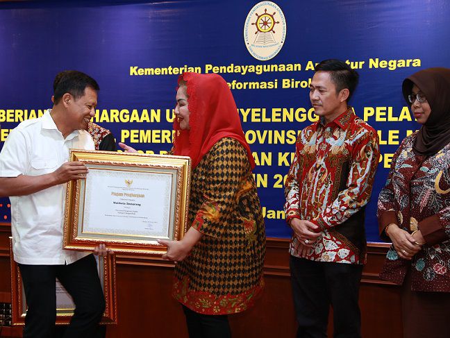 Penyerahan penghargaan itu dilakukan pada acara Penyampaian Hasil Evaluasi dan Pemberian Piagam Pelayanan Publik Tahun 2017 terhadap Kabupaten/Kota se-Indonesia di Kantor Kemenpan RB di Jalan Jendral Sudirman Kav 69 Jakarta Selatan, Rabu (24/1).