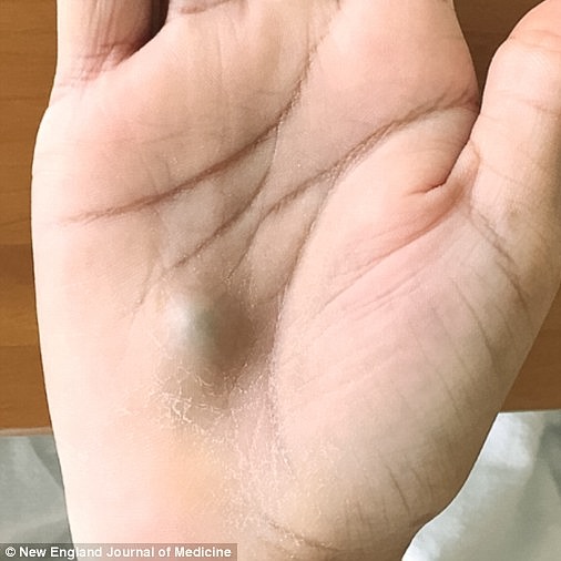Awalnya, kondisi ini bermula dengan munculnya kulit berisik berwarna merah pada telapak tangan. Dalam waktu dua minggu, kulit yang bersisik itu mulai membiru diikuti dengan benjolan yang nampak jelas dengan mata telanjang.