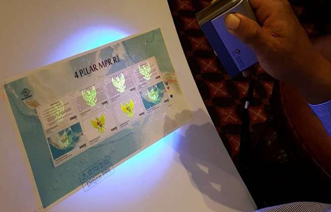 “Lewat sinar UV maka prangko 4 Pilar MPR akan tampak hologram dengan gambar Burung Garuda dan tulisan 4 Pilar MPR RI dengan teknologi micro text. Ini membedakan prangko 4 Pilar MPR dengan prangko-prangko biasa lainnya,” imbuh Siti.
