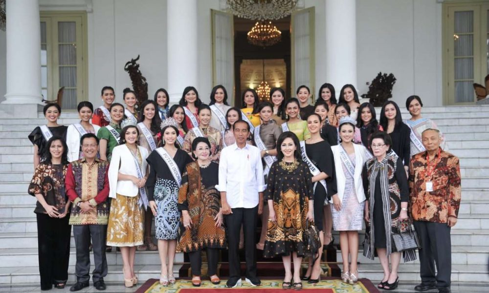Bogor – Presiden Joko Widodo menerima Yayasan Puteri Indonesia di Istana Kepresidenan Bogor, Jawa Barat, Senin (11/3/2019). Turut serta bersama Ketua Dewan Pembina Yayasan Puteri Indonesia, Putri Kus Wisnu Wardani, dalam pertemuan tersebut ialah para finalis Puteri Indonesia 2019 yang mewakili seluruh provinsi di Indonesia dan Miss Universe 2018 asal Filipina Catriona Gray.