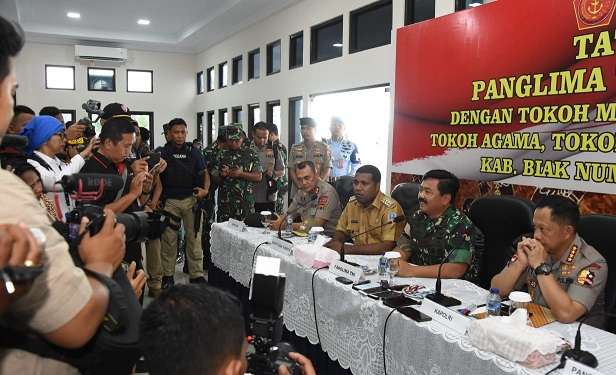 “Kalau kita tidak paham dengan akar permasalahan di Papua, maka akan memengaruhi proses pengambilan keputusan. Oleh sebab itu tidak perlu takut, sampaikan masukan dan saran apa adanya,” kata Hadi Tjahjanto, didampingi Kapolri Jenderal Pol Tito Karnavian, saat tatap muka dengan Tokoh Masyarakat, Tokoh Adat, Tokoh Agama, Tokoh Pemuda dan Tokoh Wanita, Kabupaten Biak Numfor dan Kabupaten Supiori, di VIP Room, Lanud Manuhua, Biak, Provinsi Papua, Selasa (27/8/2019).