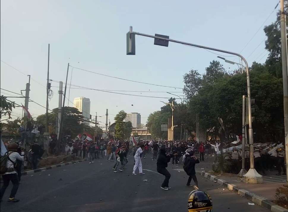 Mahasiswa dan pelajar STM membabibuta melempar aparat kepolisian dengan batu dan bekas botol air mineral.