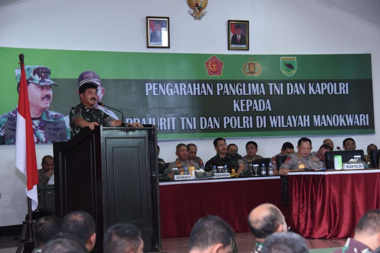 Mengawali pengarahannya, Panglima TNI menyampaikan ucapan terima kasih kepada seluruh Komandan/Kepala Satuan TNI-Polri di wilayah Manokwari yang telah melaksanakan tugas dengan baik atas sinergitas TNI-Polri di lapangan. “Tetap jaga sinergitas TNI-Polri untuk menjaga Negara Kesatuan Republik Indonesia (NKRI) yang kita cintai bersama,” tegas Hadi Tjahjanto.
