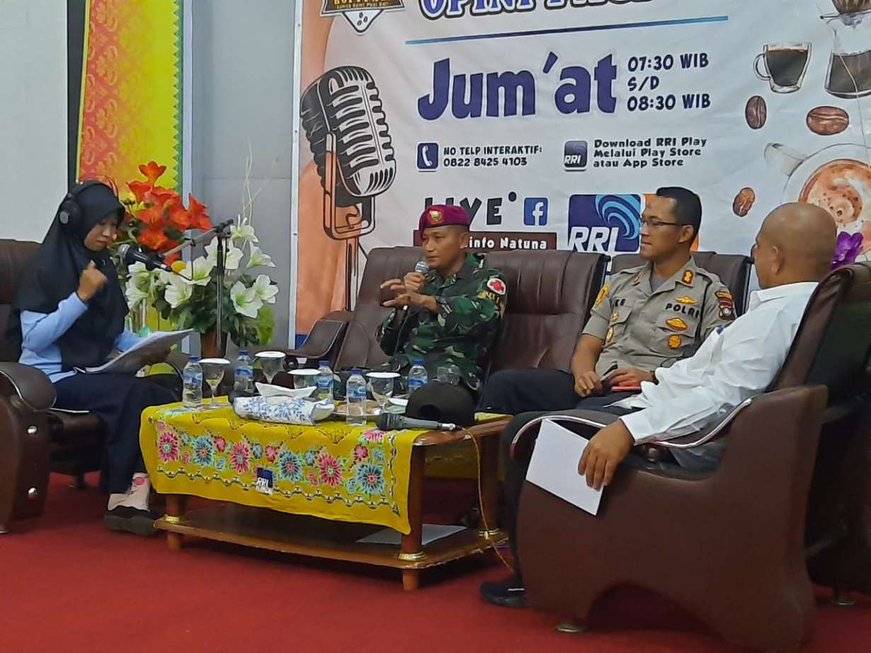 Natuna – Tim Kesehatan Komando Gabungan Tugas Terpadu (Kogasgabpad TNI AD, TNI AL, TNI AU) Operasi Bantuan Kemanusiaan Natuna yang diketuai oleh Danyonkes 1 Marinir Letkol Laut (K) drg. Muh. Arifin, Sp. Ort, M.Tr.Opsla, melaksanakan sosialisasi Coronavirus Disease 2019 (Covid-19) melalui udara pada acara “Opini Pagi Hari” di Stasiun RRI Ranai, Jl. Raya Sepempang, Bunguran Timur, Kabupaten Natuna, Kepulauan Riau, Jumat (20/3/2020).