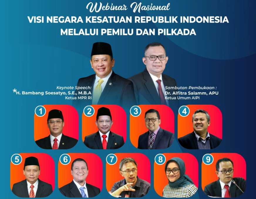 Webinar dengan tema “Visi Negara Kesatuan Republik Indonesia (NKRI) Melalui Pemilu dan Pilkada”, menghadirkan narasumber, Ahmad Basarah (Wakil Ketua MPR), Tito Karnavian (Mendagri), Arif Budiman (Ketua KPU), Abhan (Ketua Bawaslu), Muhamad (Ketua DKPP). Pembahas dari penggiat Pemilu adalah Jery Sumampow dan Khoirunnisa Nur. Pengantar Diskusi oleh Alfitra Salaam (Ketua Umum AIPI) dan moderator diskusi Nur Hidayat Sardini (Ketua AIPI Semarang)
