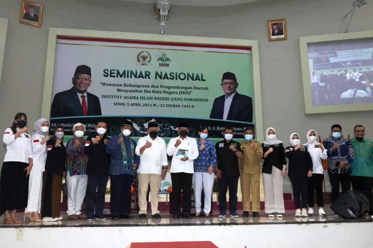 Seminar dengan tema Wawasan Kebangsaan dan Pembangunan Daerah Menyambut Ibu Kota Negara (IKN), diikuti sejumlah senator, Menteri Pekerjaan Umum dan Perumahan Rakyat, M. Basuki Hadimoeljono (hadir virtual), utusan Gubernur Kalimantan Timur, utusan Bupati Penajam Paser Utara, Rektor IAIN Samarinda Prof. Muhammad Ilyasin, serta staf ahli Bappenas Dr. Son Diamar.