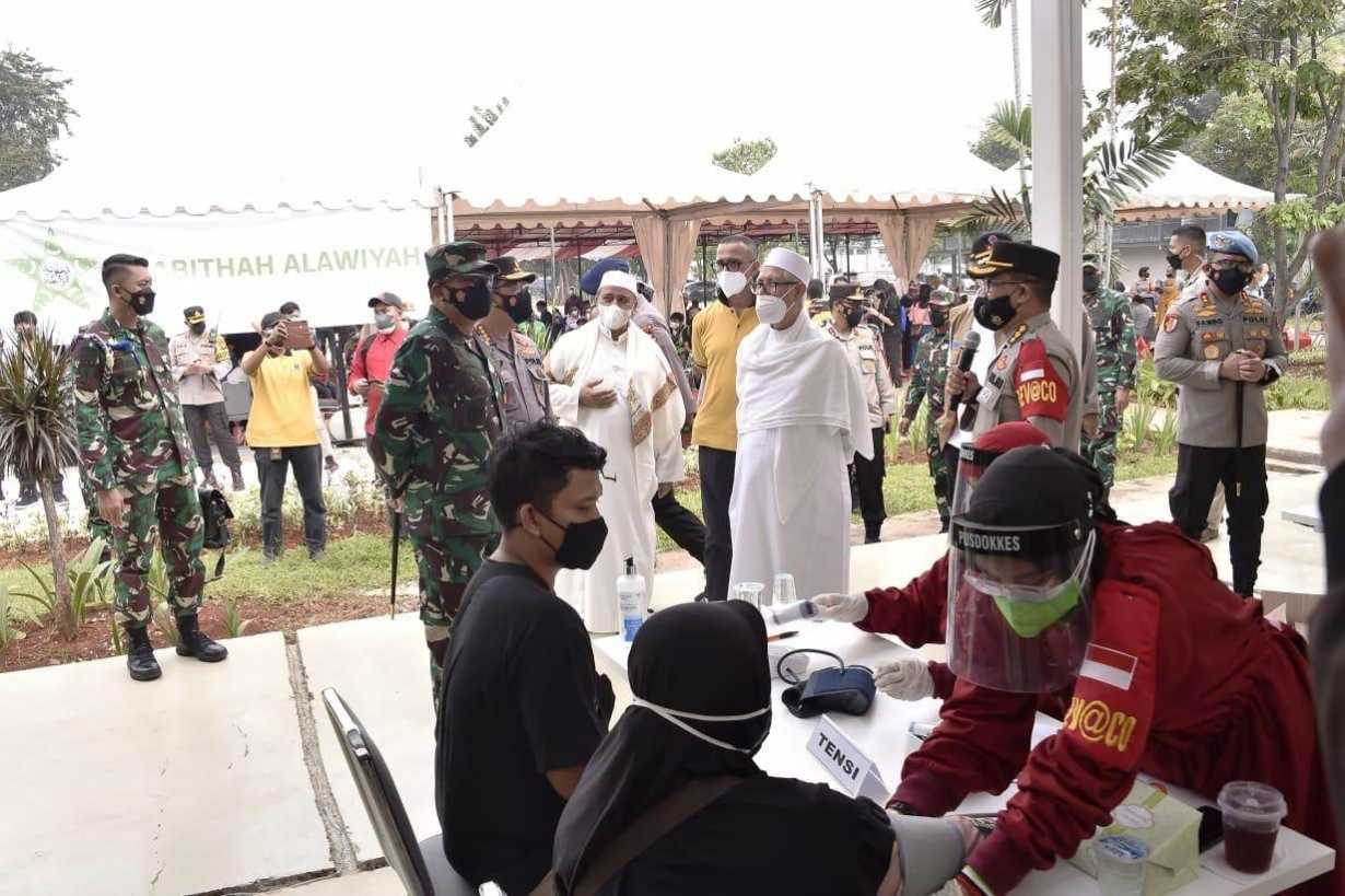 Jakarta – Panglima TNI Marsekal TNI Hadi Tjahjanto, S.I.P. bersama Kapolri Jenderal Polisi Drs. Listyo Sigit Prabowo, M.Si., dan Kepala BNPB Letjen TNI Ganip Warsito, S.E., M.M. meninjau langsung pelaksanaan serbuan vaksinasi bagi warga masyarakat, di tiga lokasi, Jakarta Selatan, Selasa (6/7/2021).