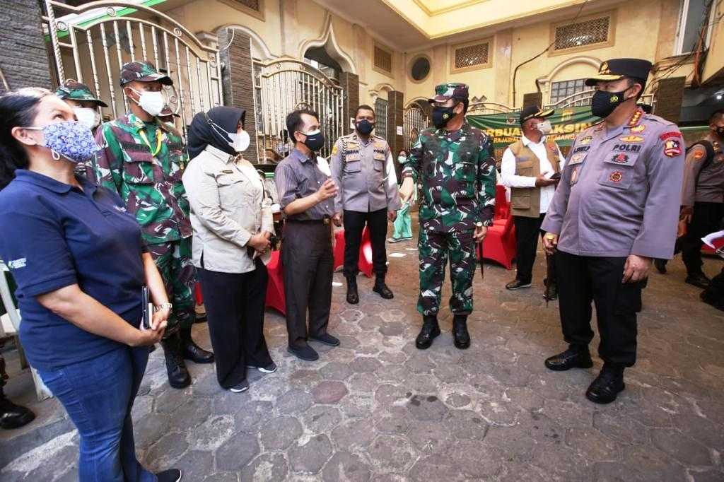 Di sela-sela peninjauannya, Panglima TNI Marsekal TNI Hadi Tjahjanto menyempatkan berdialog dengan salah satu warga yang juga merupakan anggota Forum Kewaspadaan Dini Masyarakat (FKDM) Kelurahan Pademangan.