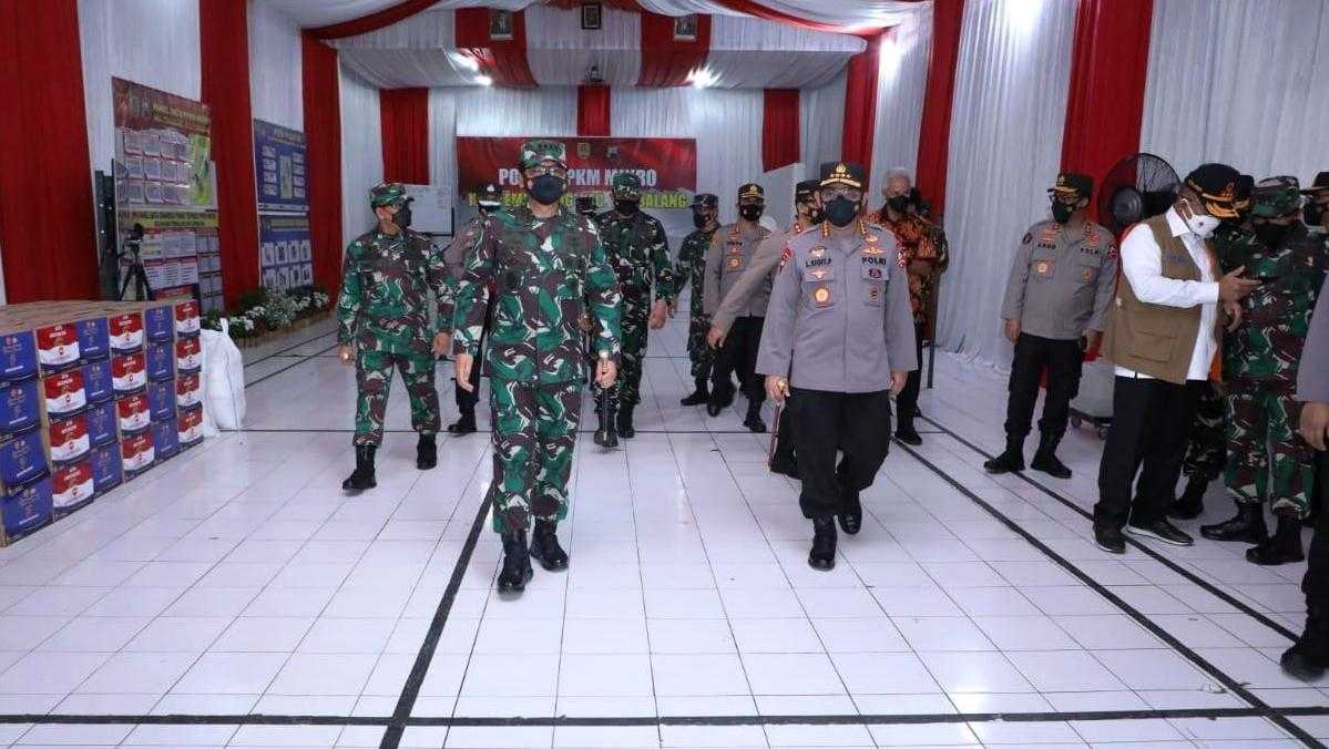 Selanjutnya Panglima TNI beserta rombongan meninjau Posko PPKM Darurat di Kelurahan Tembalang, dan membagikan paket sembako berupa beras, gula, minyak goreng dan mie instan secara simbolik kepada warga yang terdampak PPKM Darurat, untuk menghindari kerumunan massa.