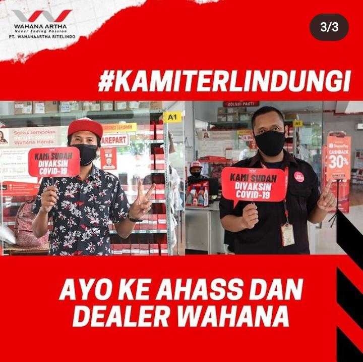 Wahana telah menetapkan vaksin adalah hal wajib bagi seluruh SDM yang melayani kebutuhan konsumen. Tidak hanya PIC atau pemilik Dealer dan AHASS, Front Line People hingga Mekanik dipastikan telah melakukan vaksin yang telah dijalankan Wahana sejak awal Juni.