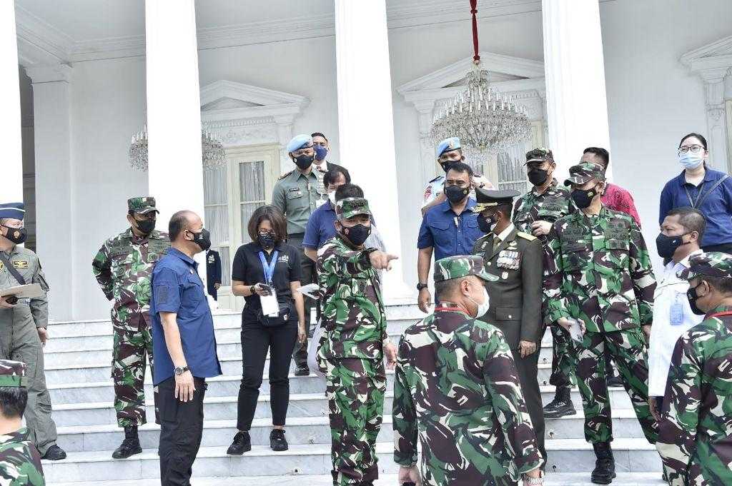 Liputan.co.id, Jakarta – Kepala Staf Umum (Kasum) TNI Letjen TNI Eko Margiyono, M.A. didampingi Irjen TNI Letjen (Mar) TNI Bambang Suswantono, S.H., M.H., M.Tr., Asops Panglima TNI Mayjen TNI Syafruddin, Aspers Panglima TNI Marsda TNI A. Gustaf Brugman, M.Si meninjau pelaksanaan Gladi Bersih HUT Ke-76 TNI, yang dipusatkan di Istana Merdeka Jakarta, Minggu (3/10/2021).