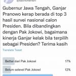 Sementara Ganjar Pranowo dinilai kinerjanya bakal sama dengan Jokowi. “Better dari Pak Jokowi sebanyak 17 persen, belum selevel Pak Jokowi 13 persen dan sama dengan Pak Jokowi 71 persen,” demikian hasil jejak pendapat buat Ganjar.