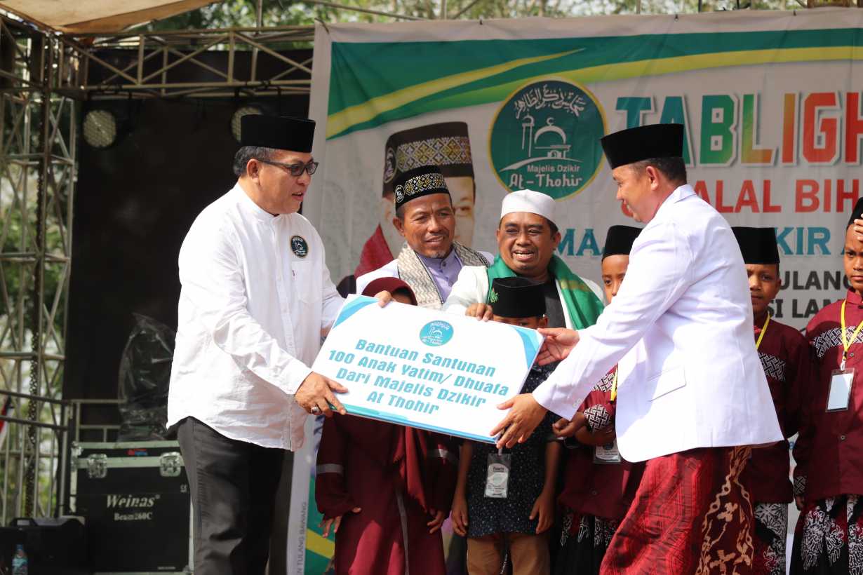 LAMPUNG – Majelis Dzikir At-Thohir kembali menggelar tabligh akbar, santunan ratusan anak yatim dan bantuan dana kepada pondok pesantren di Pondok Pesantren Darul Islah, Simpang 5 Kampung Purwajaya, Kec. Banjar Margo, Kabupaten Tulang Bawang (Tuba) Provinsi Lampung, Kamis (19/5).