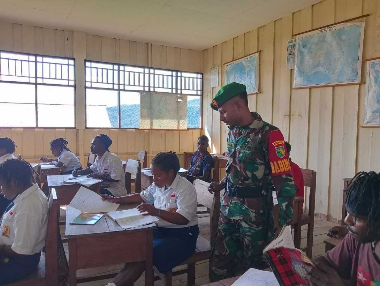 LIPUTAN.CO.ID, Timika – Dalam rangka mendukung perkembangan pendidikan di wilayah binaannya, Babinsa Koramil 1710-05/Jila dipimpin Sertu Rusef membantu pengawasan ujian semester ganjil di SD Inpres Jila, Senin (31/10/2022).