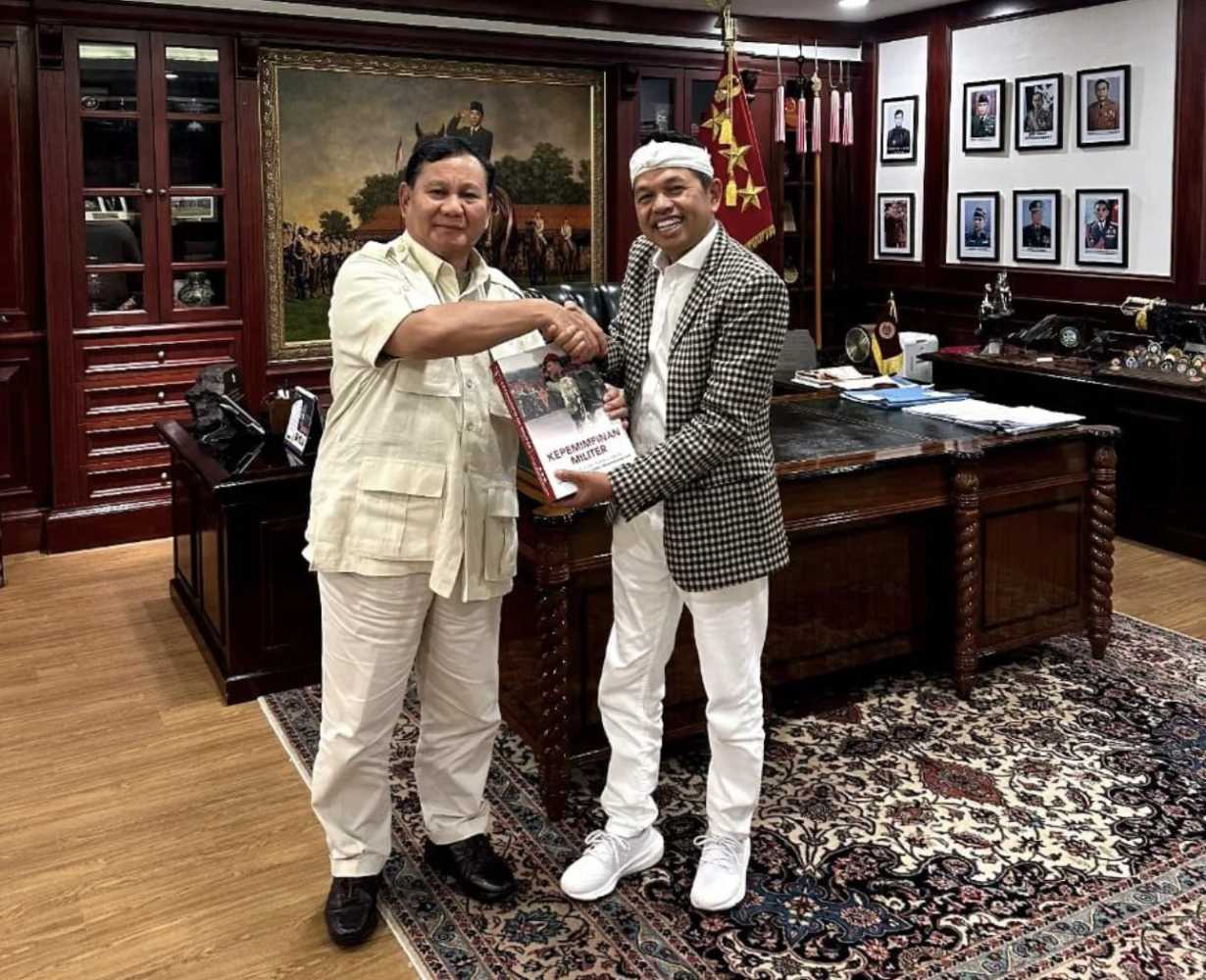 Dalam foto itu, Dedi nampak bersalaman dengan Prabowo di sebuah ruangan. Sambil bersalaman, keduanya memegang buku Kepemimpinan Militer karya Prabowo Subianto.