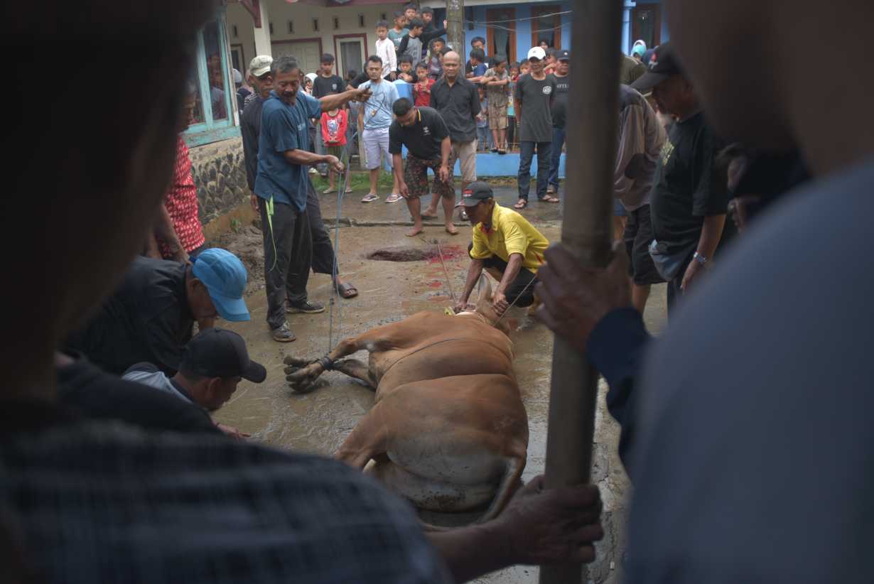 LIPUTAN.CO.ID Tasikmalaya – Warga Kampung Cigintung, Desa Aljasari, Tasikmalaya antusias menyembelih hewan kurbanIdul Adha, Kamis 29 Juni 2023.