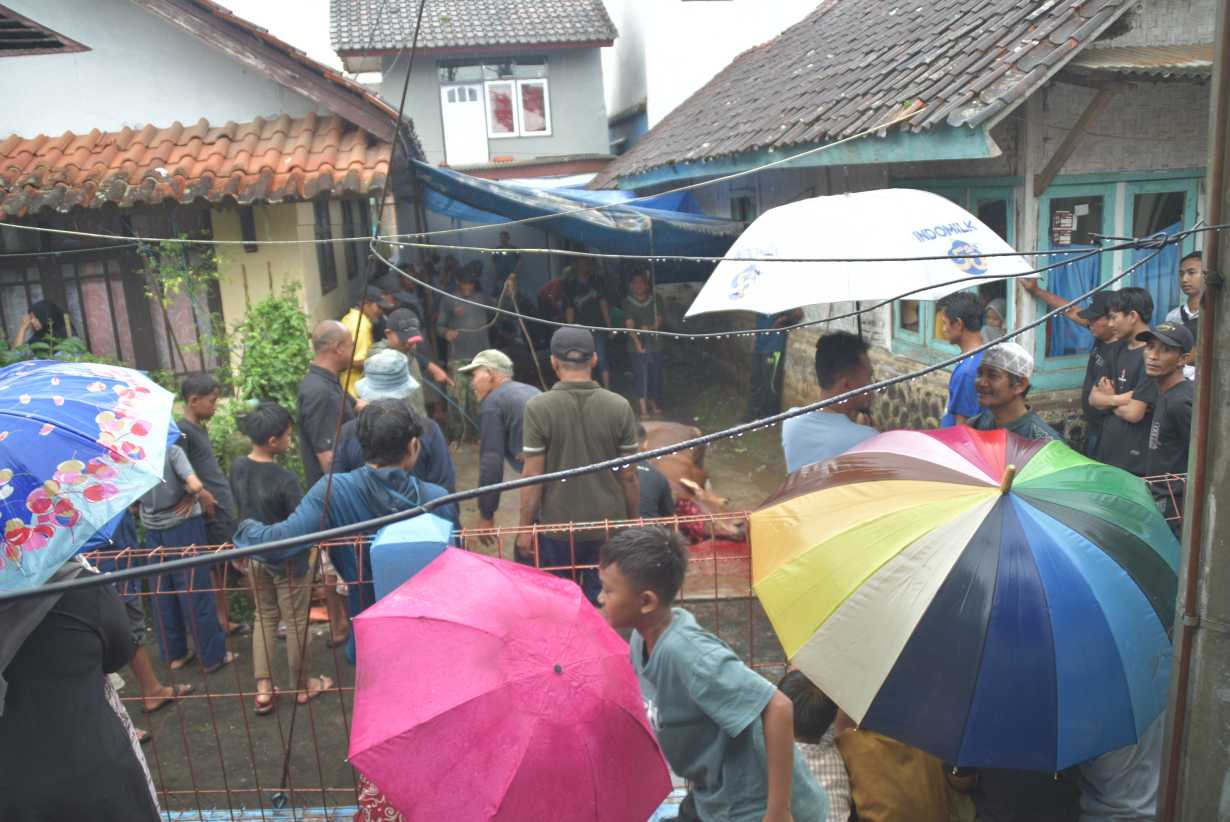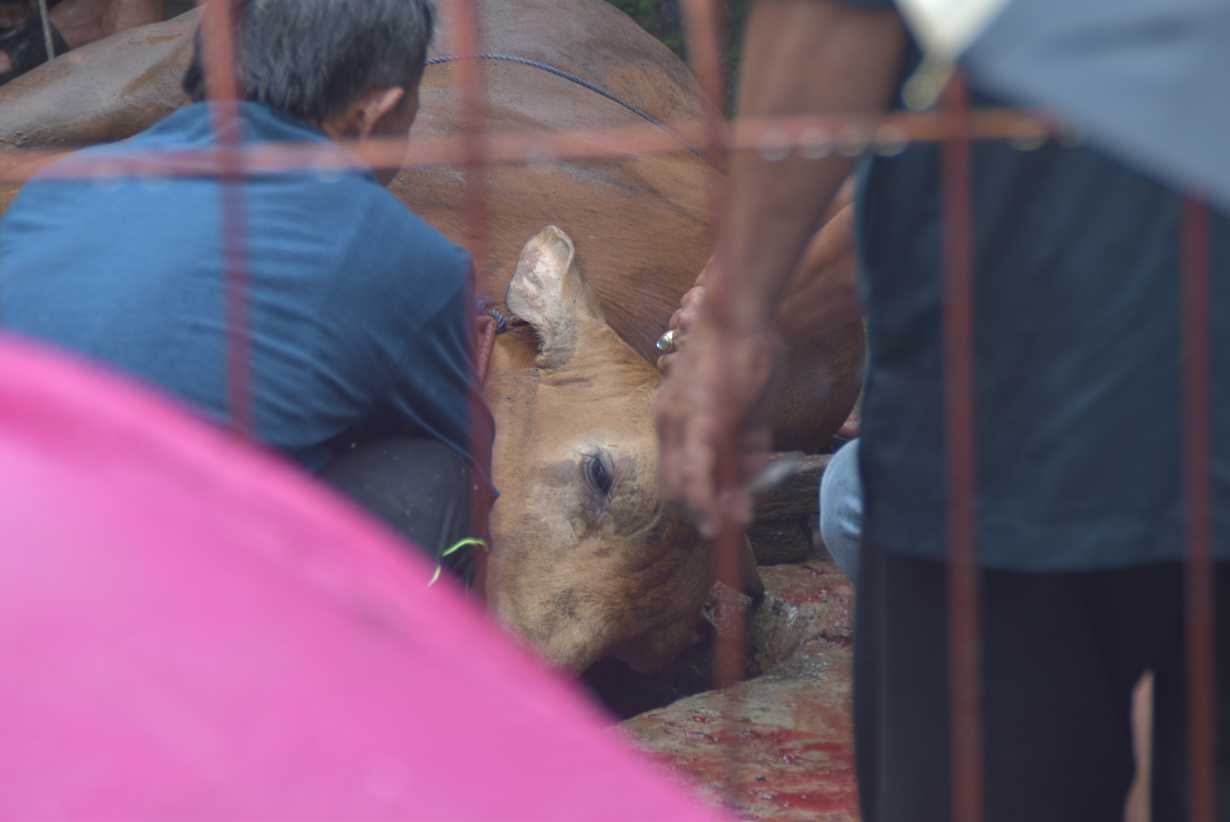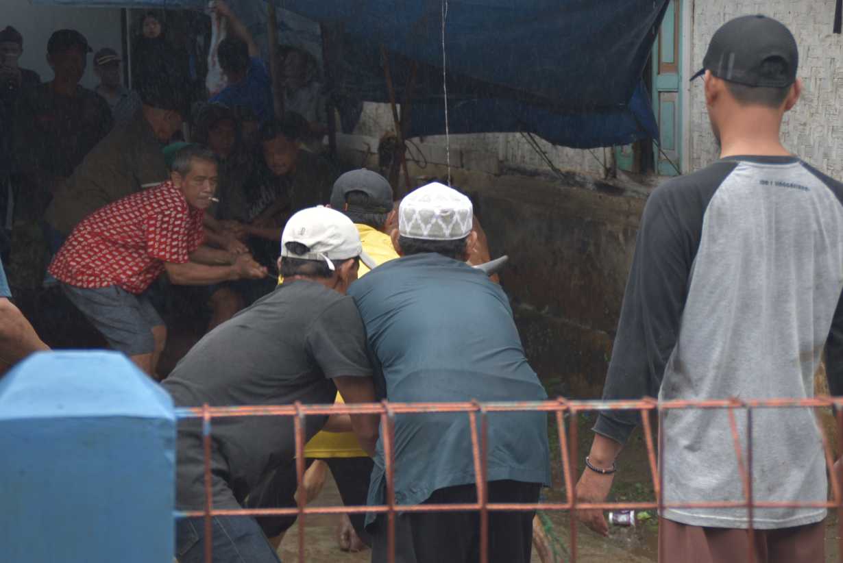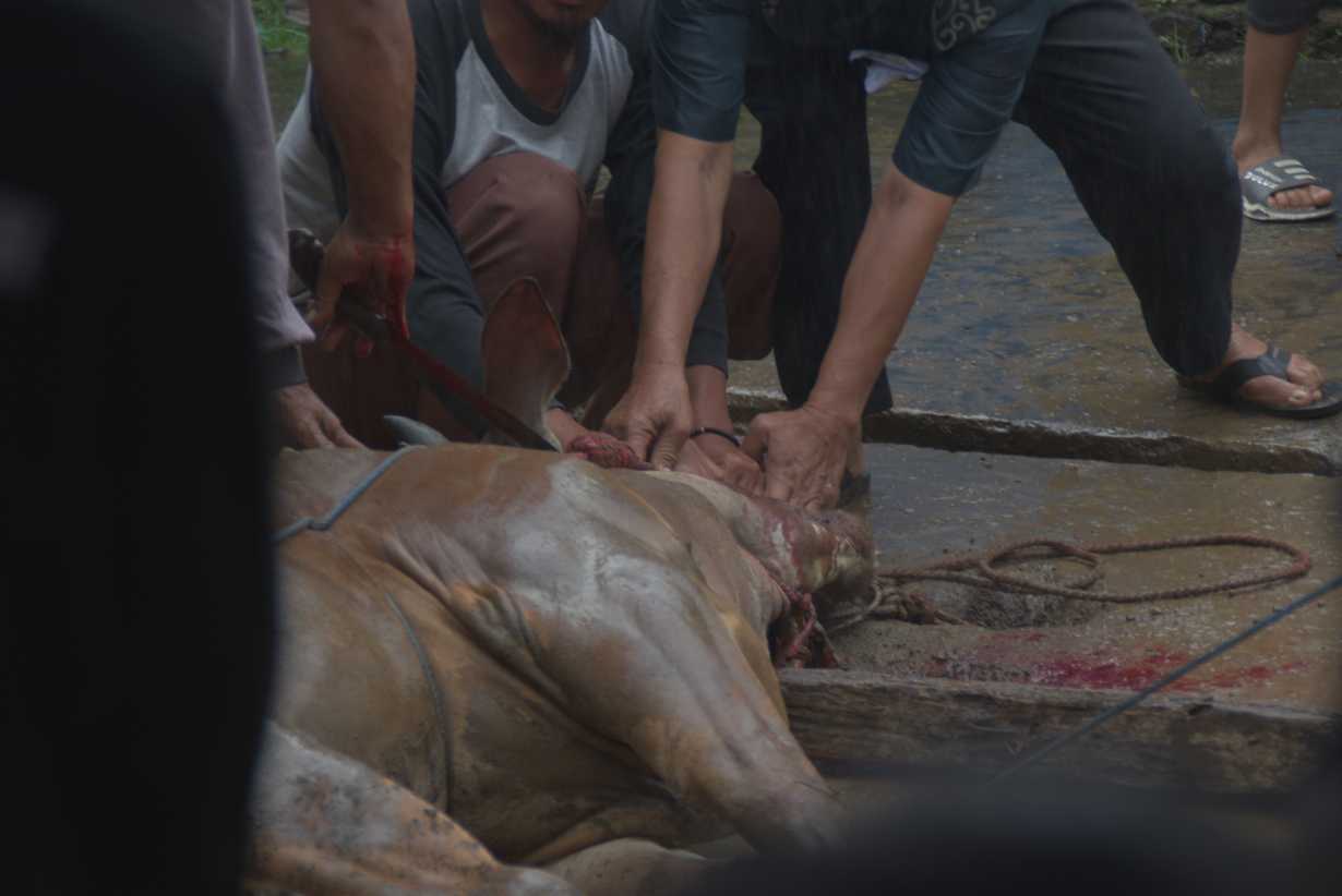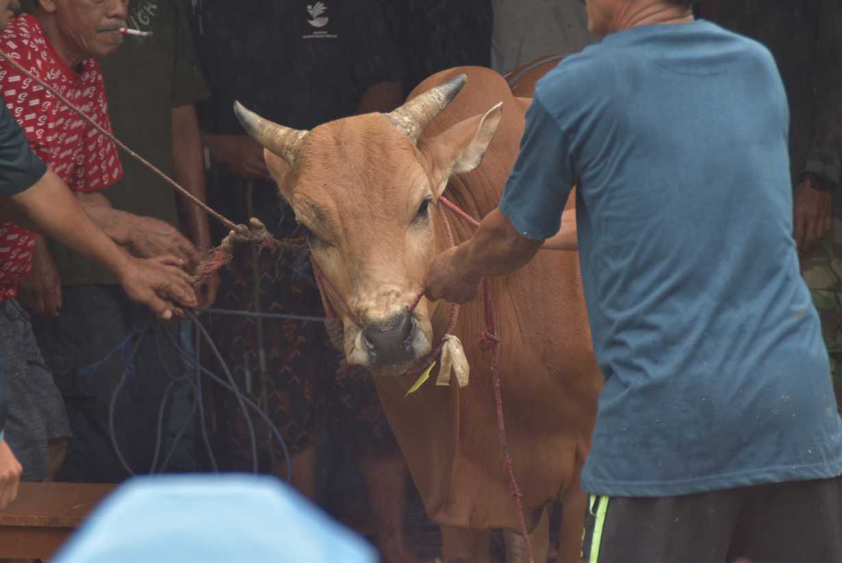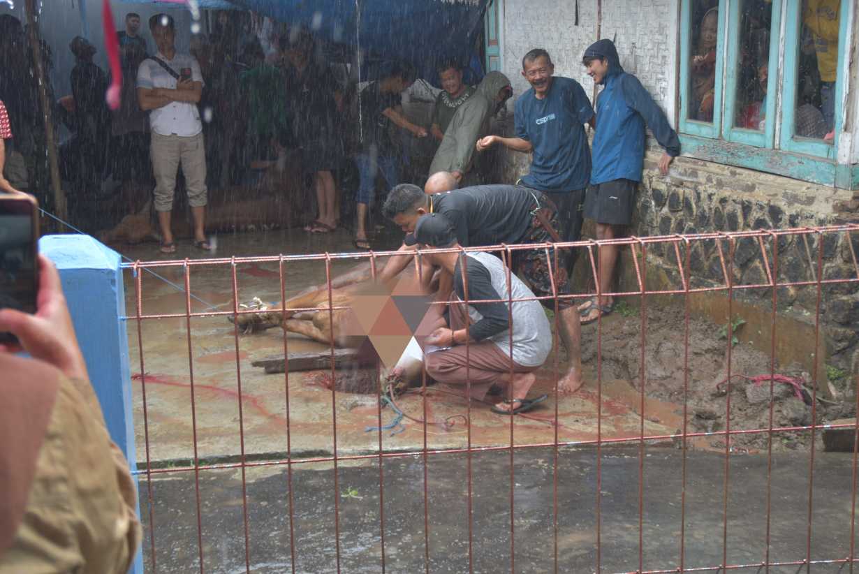 Meski hujan mengguyur, warga antusias gotong royong menyembelih hewan kurban.