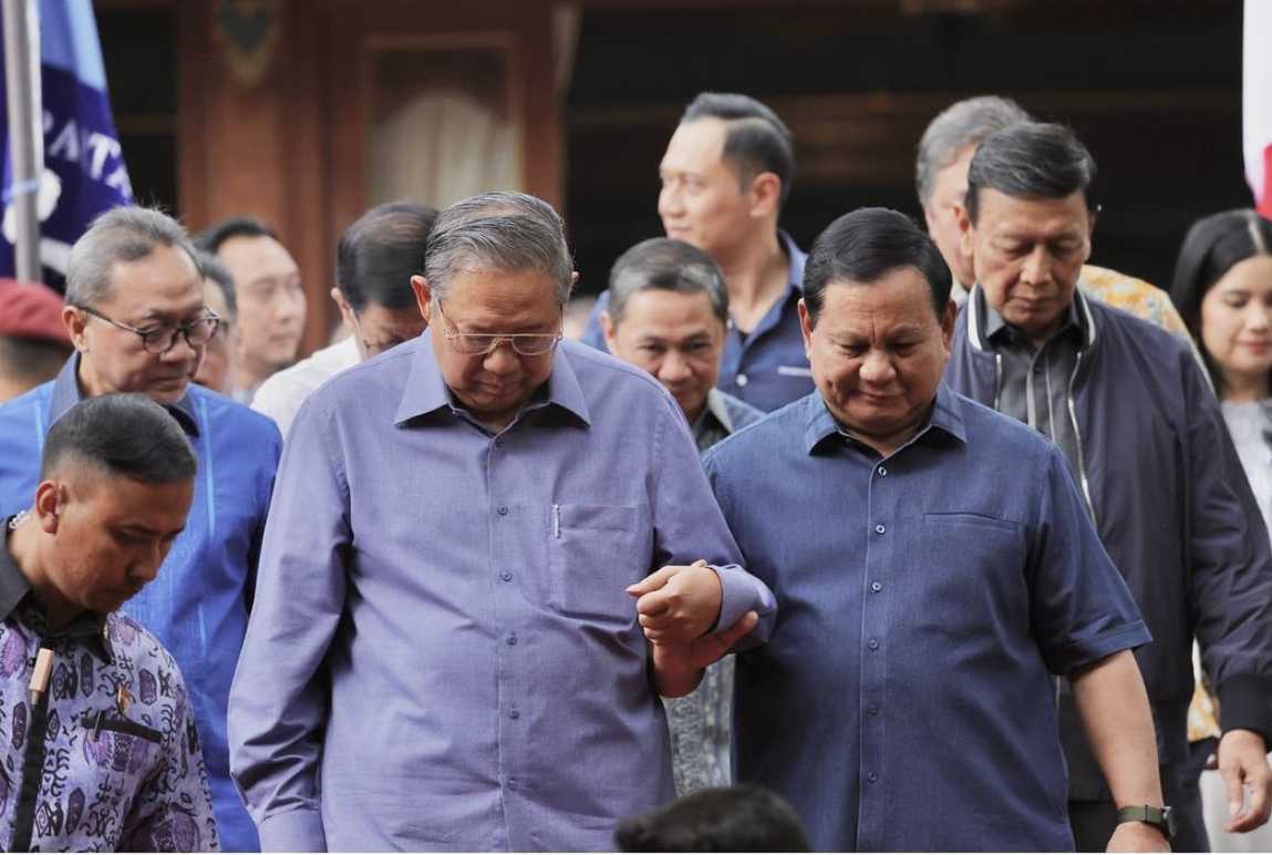 Ketua Majelis Tinggi Partai Demokrat Susilo Bambang Yudhoyono (SBY) bersama Ketua Umum Partai Demokrat Agus Harimurti Yudhoyono (AHY) dengan didampingi jajaran anggota Majelis Tinggi dan DPP Partai Demokrt bertemu Prabowo di Hambalang, Kabupaten Bogor, Jawa Barat, Minggu, 17 September 2023.