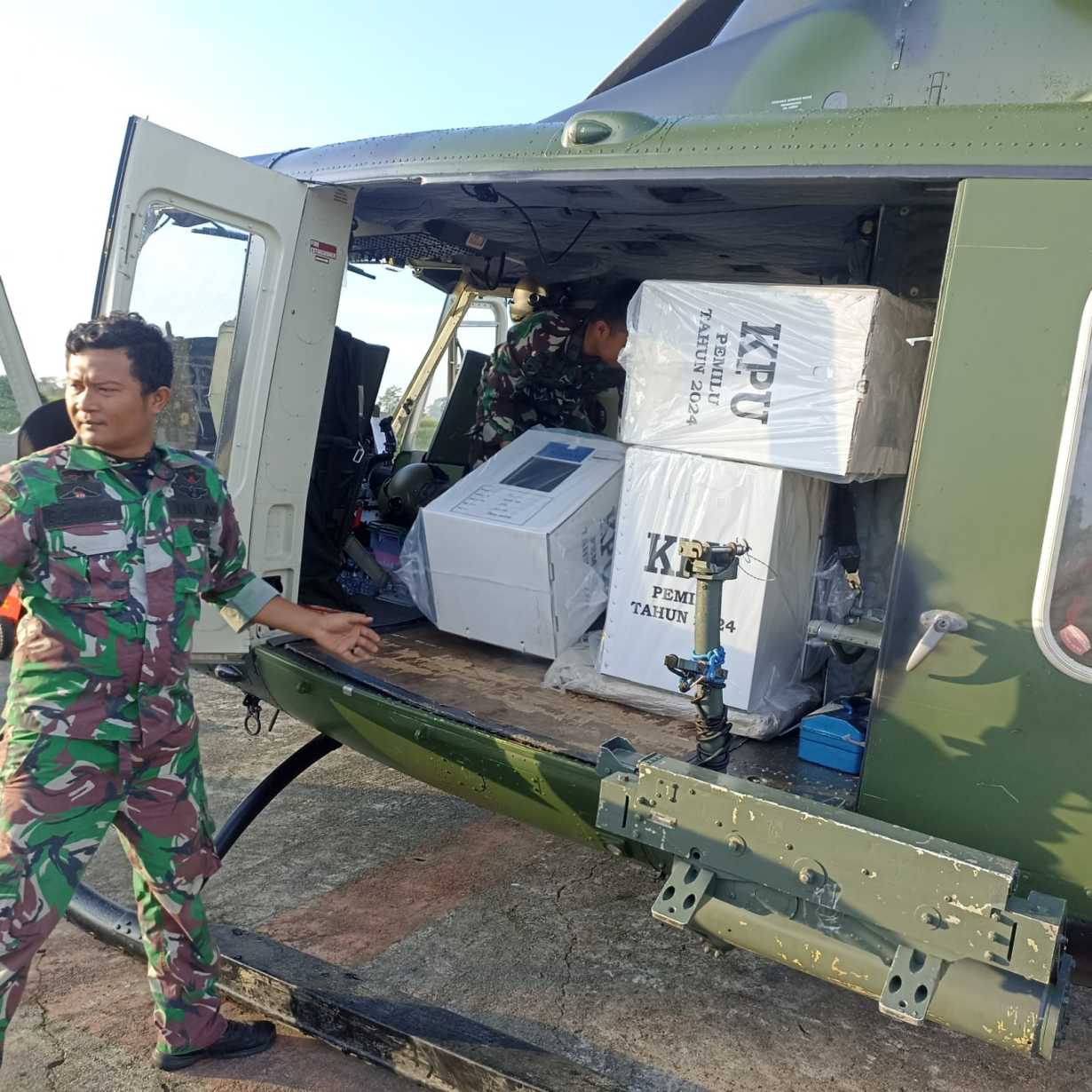 LIPUTAN.CO.ID, Timika – Untuk memastikan pendistribusian logistik Pemilu 2024 lancar, Kasdim 1710/Mimika Mayor Inf Abdul Munir bersama Kepolisian dan Pemda Mimika memonitor kegiatan pendistribusian Logistik Pemilu, di Hanggar Penerbad, Distrik Kwamki Narama, Senin (12/02/2024).