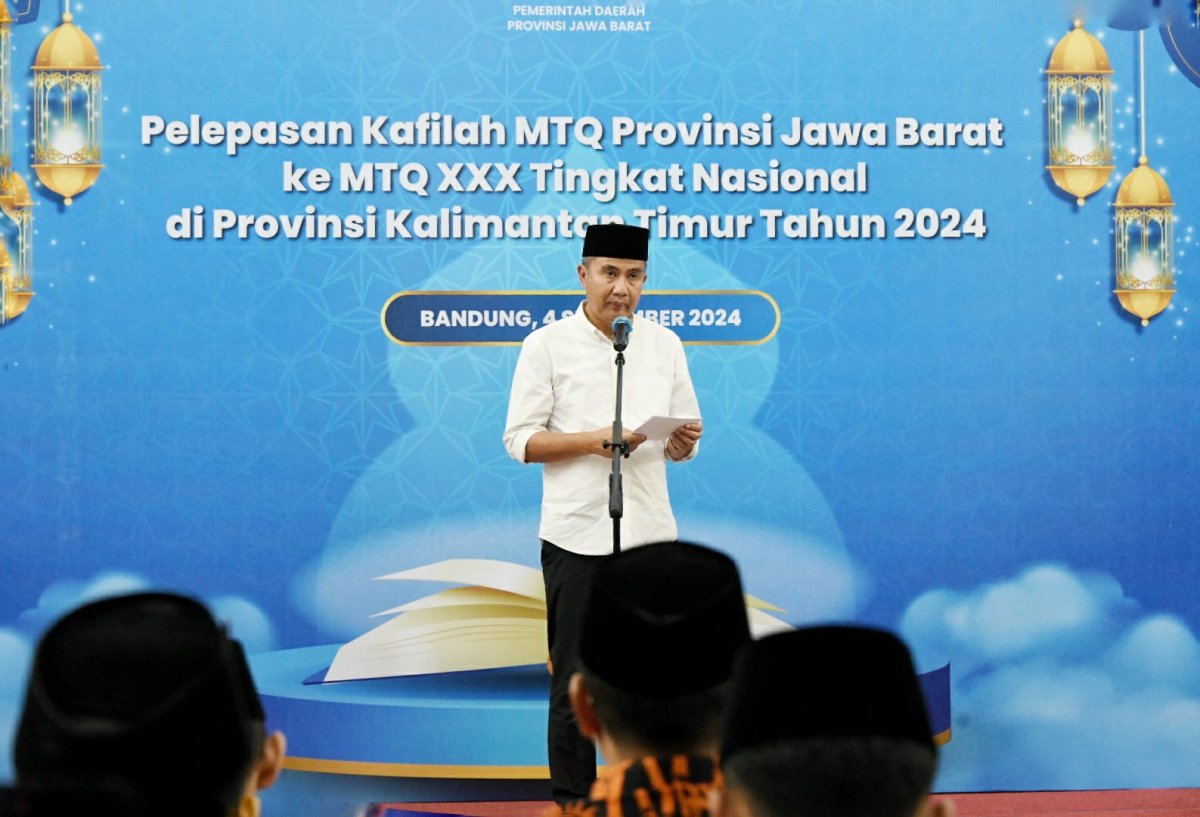KOTA BANDUNG — Penjabat Gubernur Jawa Barat Bey Machmudin melepas 160 kafilah asal Jawa Barat untuk berkompetisi di Musabaqah Tilawatul Quran Tingkat Nasional XXX di Samarinda, Kalimantan Timur, Rabu (4/9/2024).