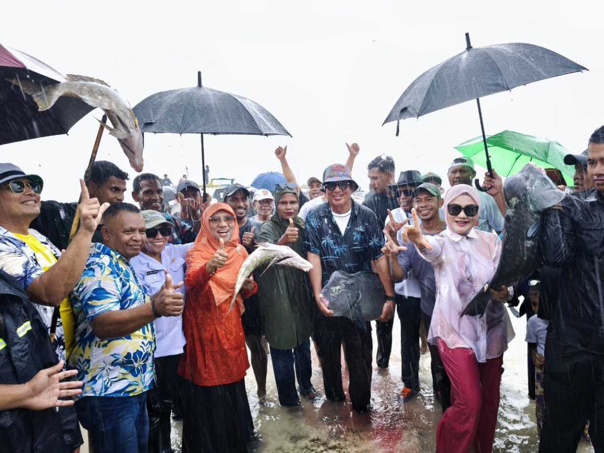 Suasana kebersamaan semakin terasa ketika Saadiah bersama Anggota Komisi III DPR RI Dapil Maluku, Widya Pratiwi, Bupati Maluku Tenggara, dan warga ikut turun langsung ke laut menggunakan tombak tradisional untuk menangkap ikan.