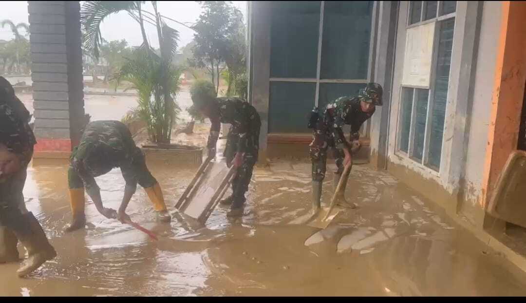 Prajurit Yonif TP 853/Bawar Reje Bur bersama aparat pemerintah daerah dan warga setempat melaksanakan pembersihan dengan mengangkat dan memindahkan material lumpur, sekaligus meratakan area yang terdampak.